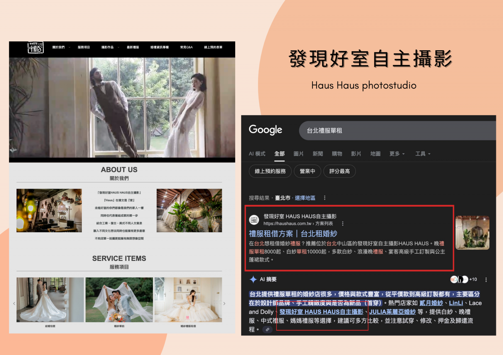 搶佔指標性關鍵字(發現好室):搜尋「台北禮服單租」,發現好室 (HAUS HAUS) 位於 SEO 第一名,並同步出現在 AI 推薦店家中,在新人心中建立起極強的品牌信任感。