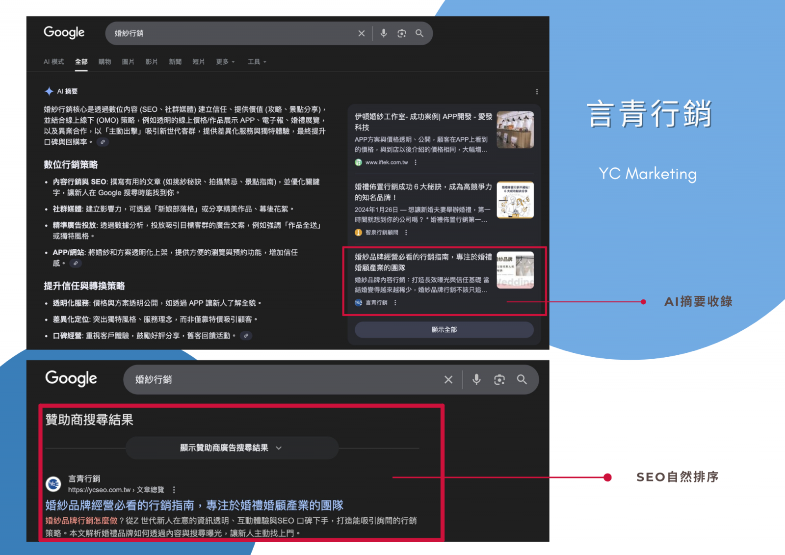 用專業內容建立影響力(言青行銷):即使是專業領域,搜尋「婚紗行銷」時,言青行銷的文章不僅自然排名第一,也同樣被收錄進 AI 摘要。這證明了有價值的內容才是 AI 時代的不二法則。