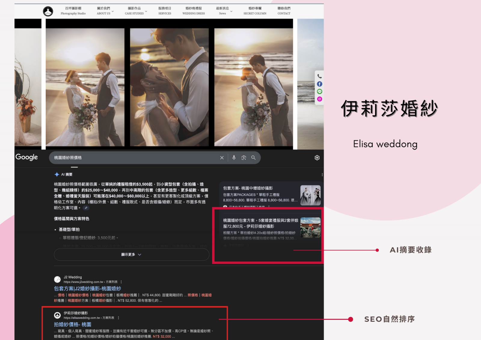 透過價格佈局集客(伊莉莎婚紗):當新人在 Google 搜尋「桃園婚紗照價格」,伊莉莎婚紗不僅 SEO 穩居排名第二,更被列入 AI Overview 優先推薦。AI 自動摘要其包套價格與「無分區不加價」等特色,信任度瞬間翻倍。