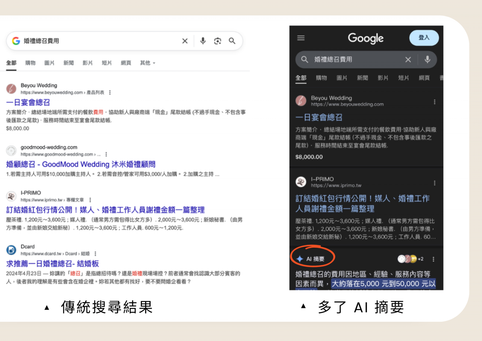 ▲ 傳統搜尋結果 vs 多了 AI 摘要的搜尋結果
