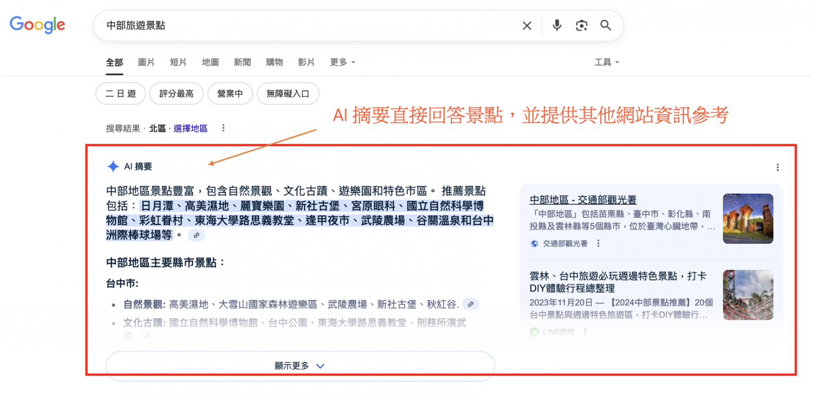 ▲ 圖片來源:google 搜尋 (搜尋景點資訊,AI會協助彙整出景點推薦內容)